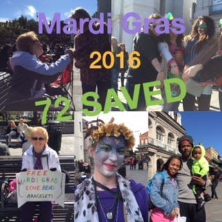 I was particularly touched by Mardi Gras attendee Morgan's beautifully painted Mardi Gras face and haunted eyes. When we met her, she was suffering because the "Bad News Christians" had used their bull horns to mock her, call her nasty names, and tell her she was going to hell. We offered her one of our Mardi Gras love bead bracelets. She took it but when we told her we were Christians, she almost bolted in fear.